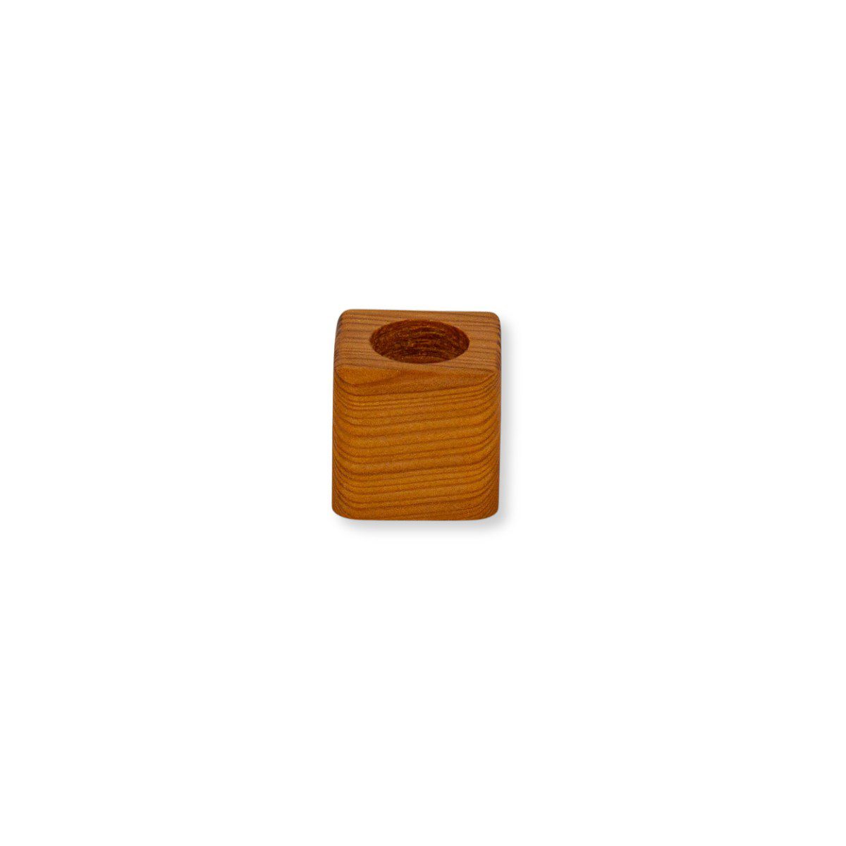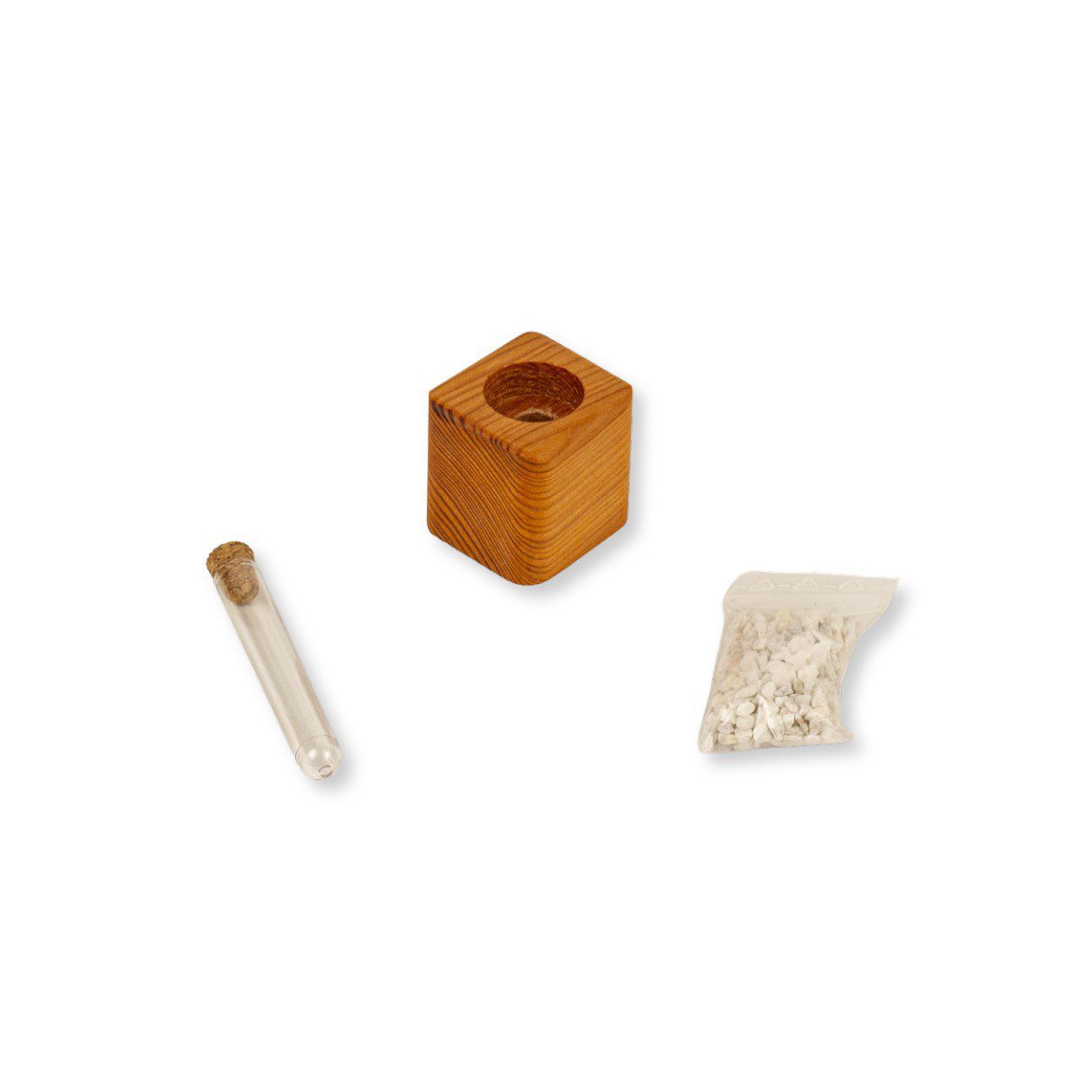 Kleines Deko-Highlight für Naturliebhaber: Ein handgefertigter Mini-Pflanztopf aus Lärchenholz mit Bohrung für ein Reagenzglas – perfekt für kleine Naturfunde. Inklusive dekorativer Steinchen zur stilvollen Aufhübschung.