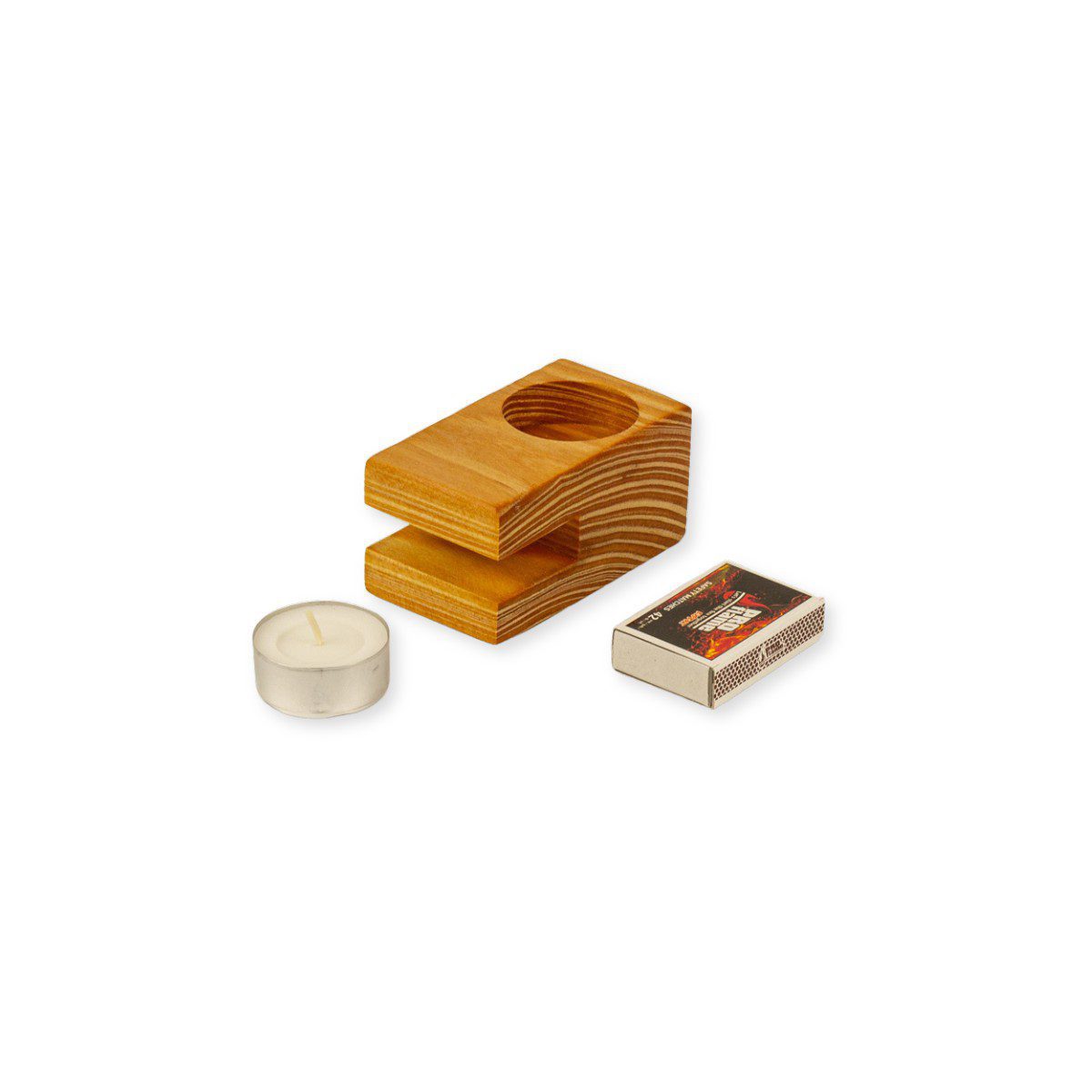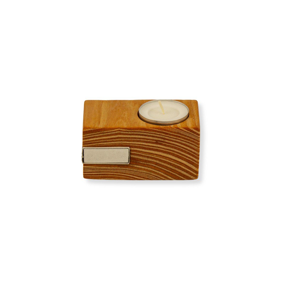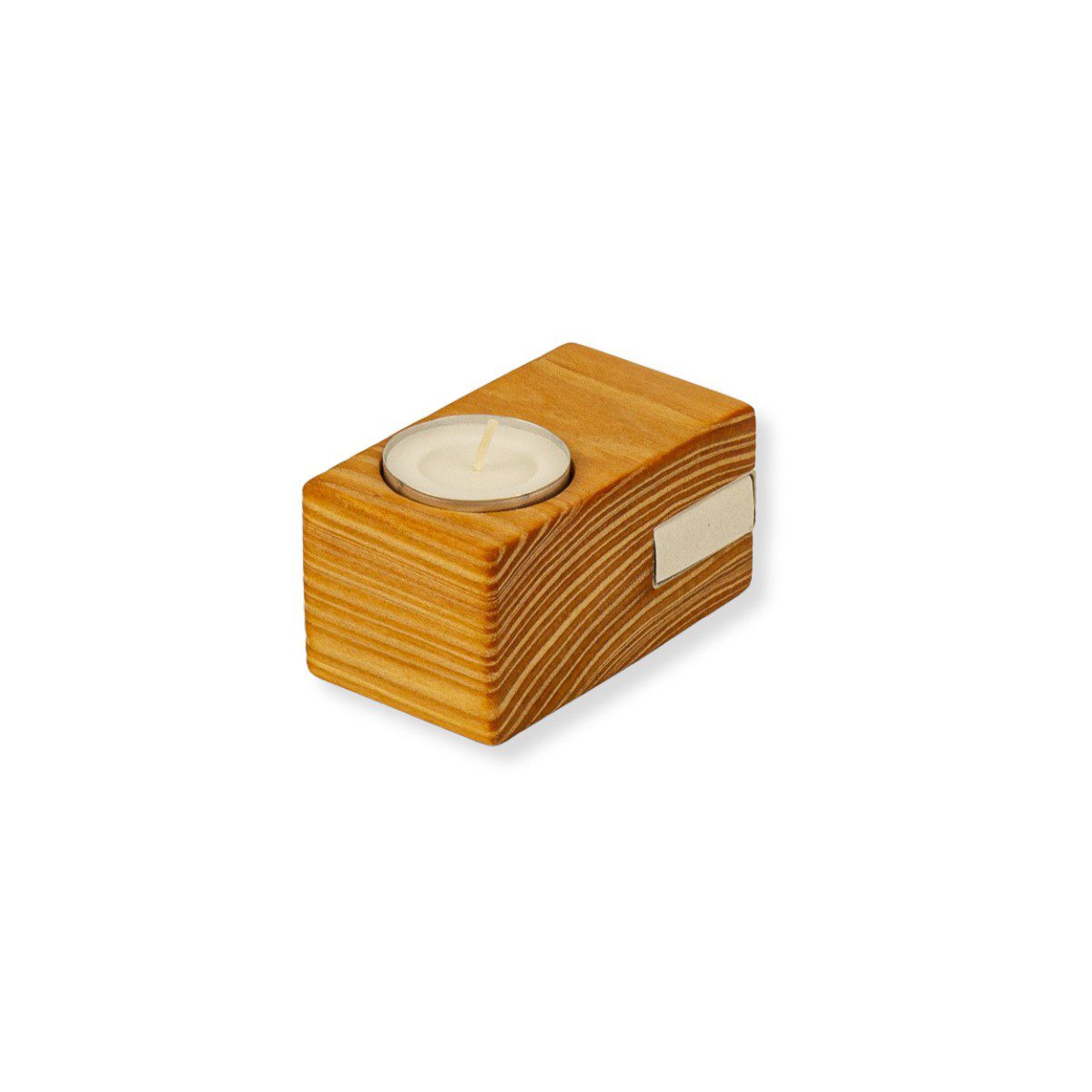Dieser Teelichthalter aus Lärchenholz ist eine kleine, praktische Idee für den Alltag: Neben dem Platz für ein Teelicht bietet er eine Aussparung für eine Streichholzschachtel – so hast du beides stets zur Hand, wenn du ein warmes Licht anzünden möchtest.